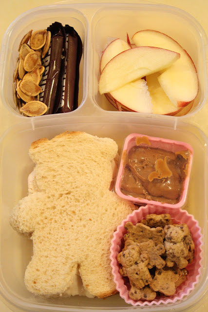 Princess lunch - roasted pumpkin seeds, Halloween candy bars, apple slices and Teddy Grahams with Biscoff spread, and a turkey bear sandwich.