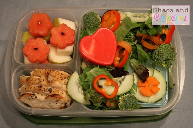 For this lunch I packed Beaker some mini sausages with ketchup, GF pasta caprese salad, a peeled and segmented Cutie orange, and a bite-sized S'Mores Crispy Treat.
